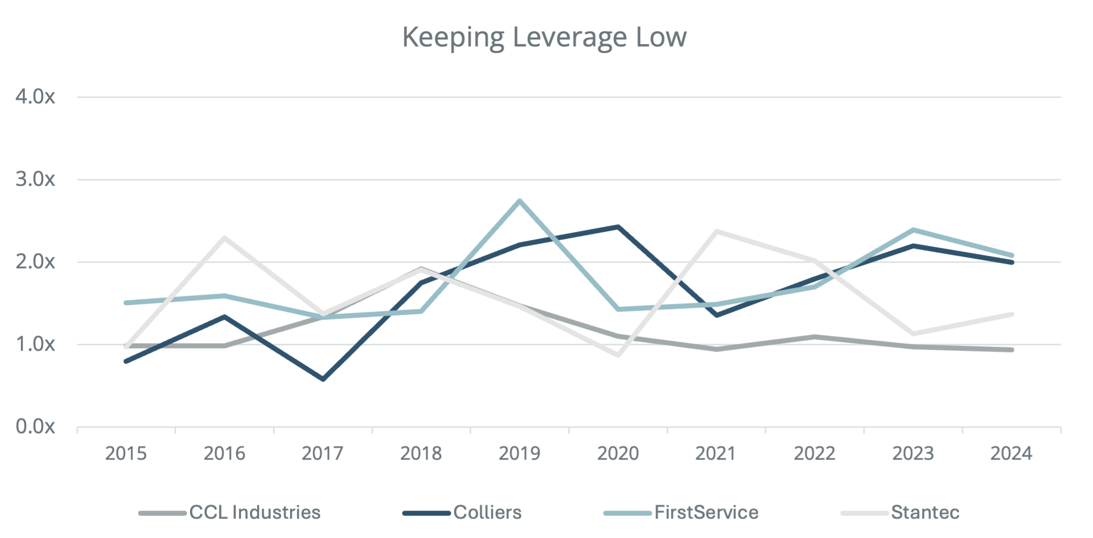 The most conservative companies — Toromont and Descartes — held net cash positions over the majority of past decade. Excluding these two, the others maintained an average net debt/EBITDA ratio of 1.5x.